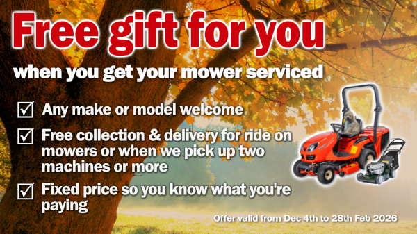 Please note that any additional parts needed and any associated fitting charge will be advised on our appraisal of your machine. We are also draining/changing the fuel on all hand held and pedestrian mowers for ASPEN 2 or 4 stroke long life fuel to get machines ready for winter storage.